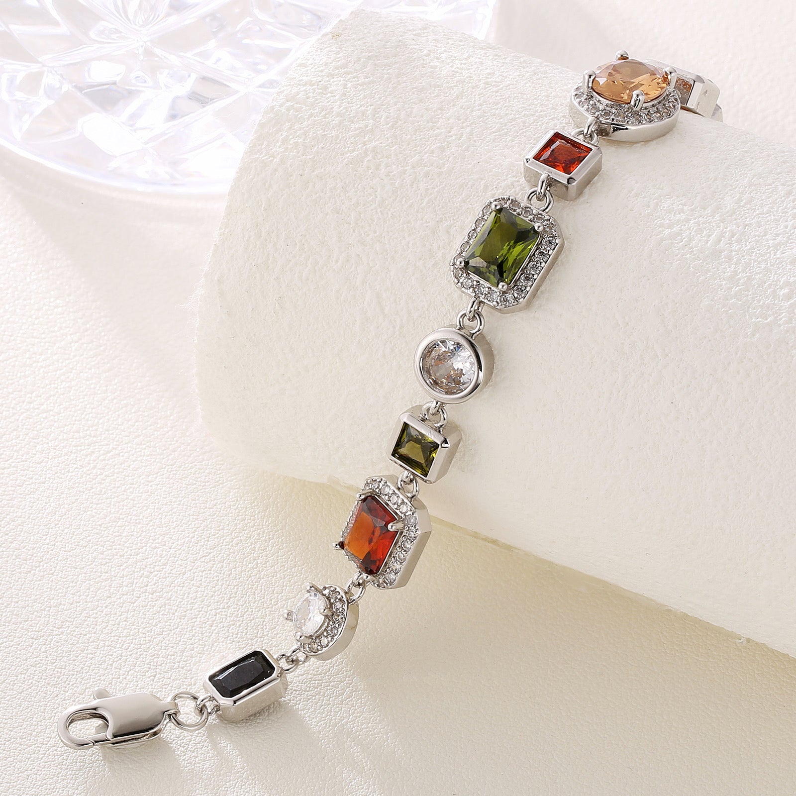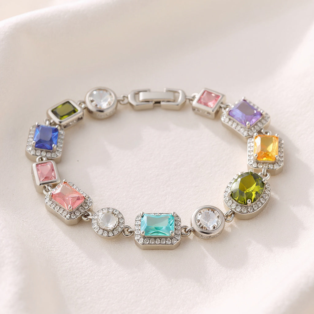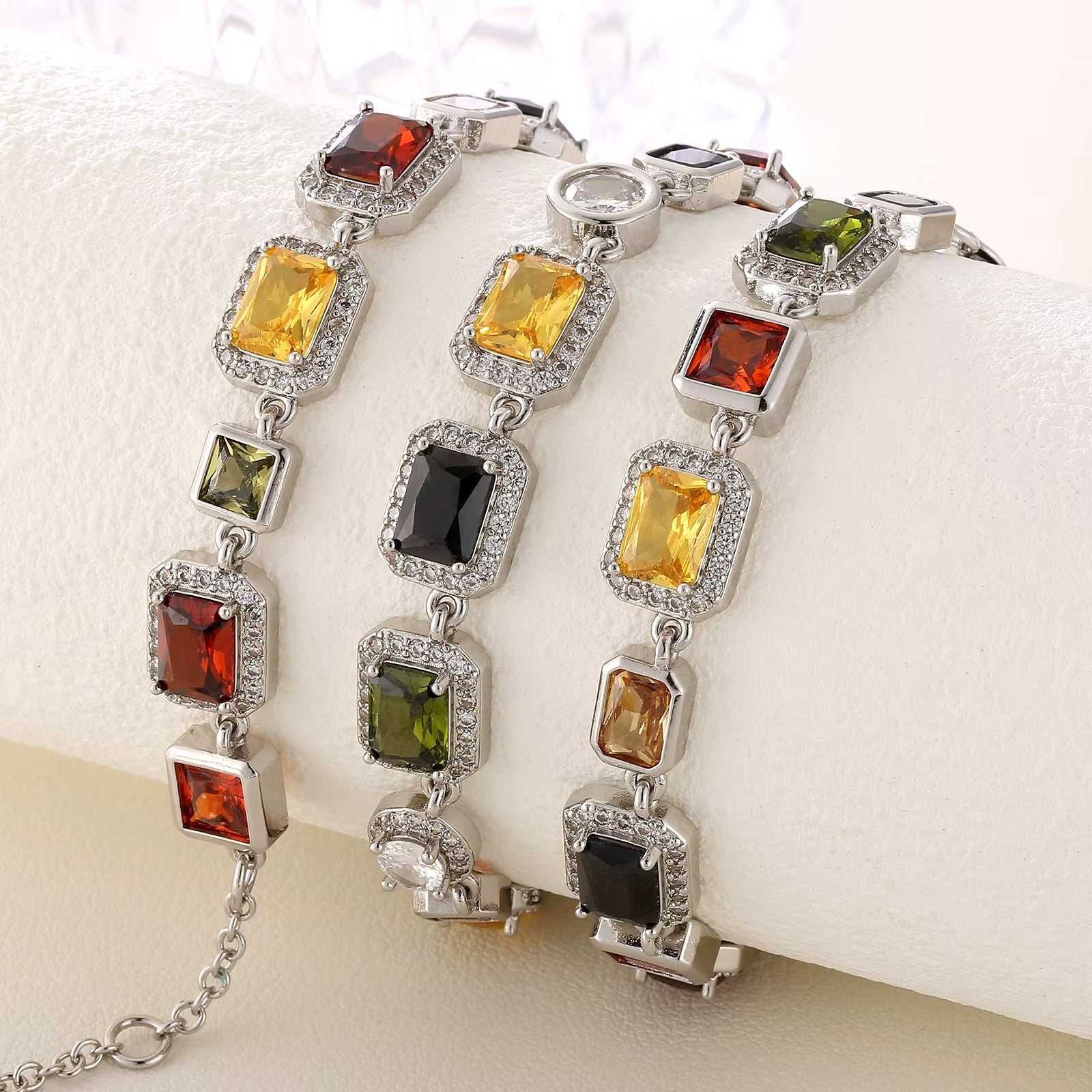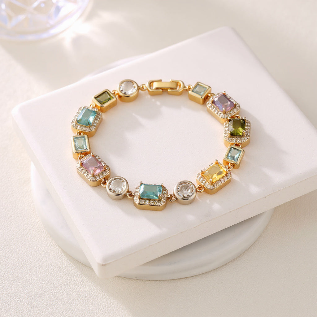Magas minőségű rézötvözetből készül, prémium arany vagy ezüst bevonattal. Ez az unisex karkötő a minimalista dizájnt színes kőberakásokkal ötvözi.